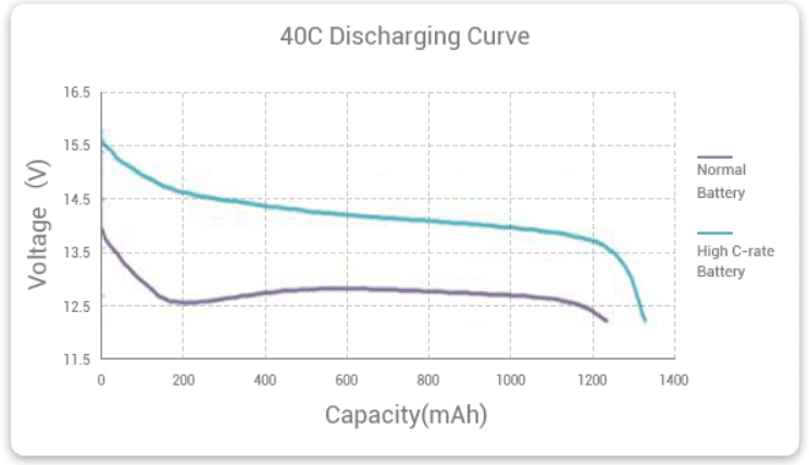 The capacity of the two batteries is the same, and the test current is 40C. We can see the discharge voltage of the high crate battery ( blue line ) is higher and how the voltage drop is smoother and the capacity greater.