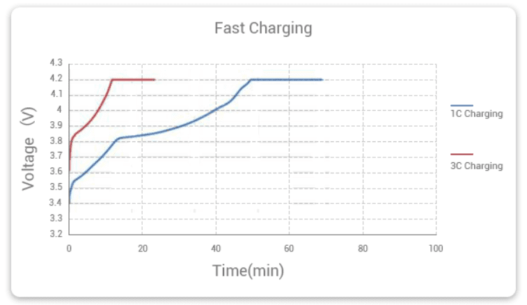The fellow picture represents a record of how long it takes to fully charge a normal and a high crate battery. The red line represents a high crate battery fast charging at 3C. It only takes 15 minutes to fully charge.
